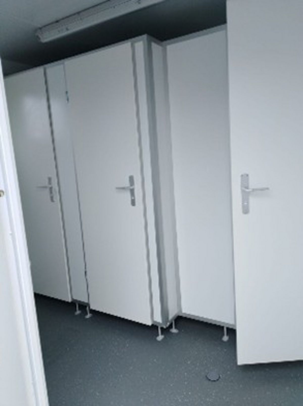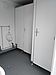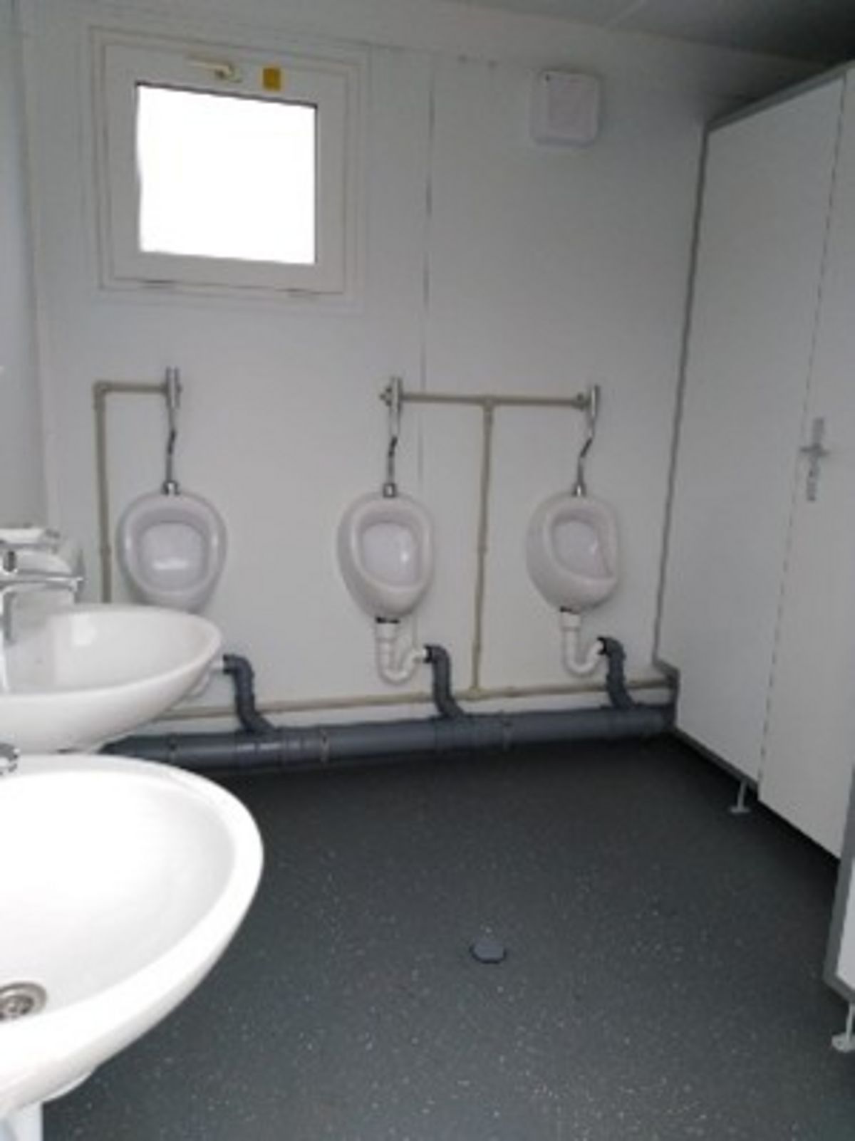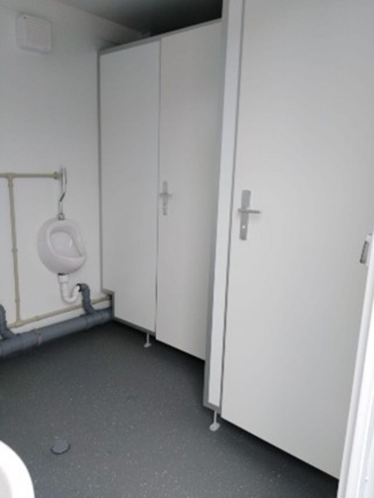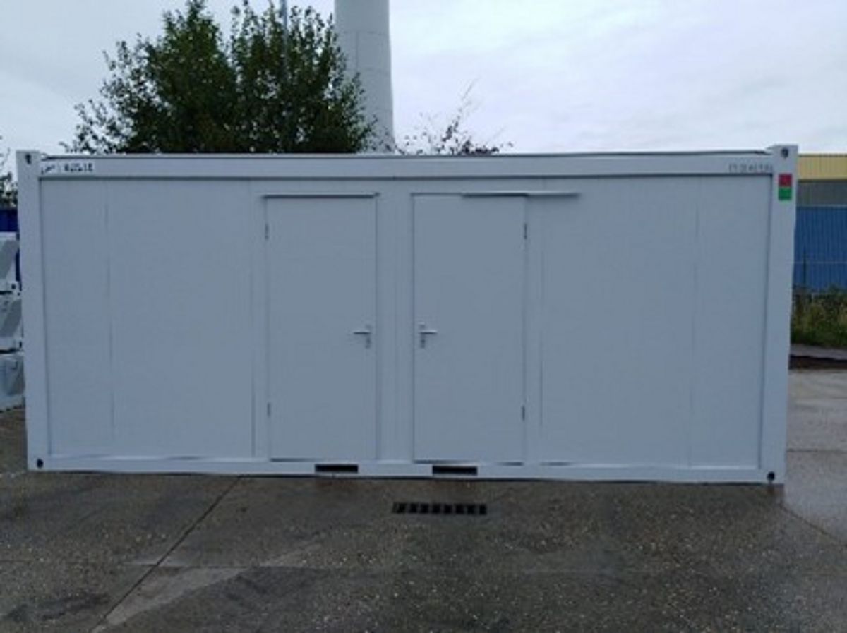 Conteneur-toilettes équipé de 2 toilettes et d’une gouttière-urinoir.