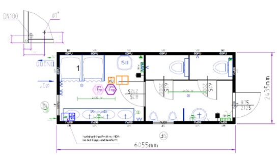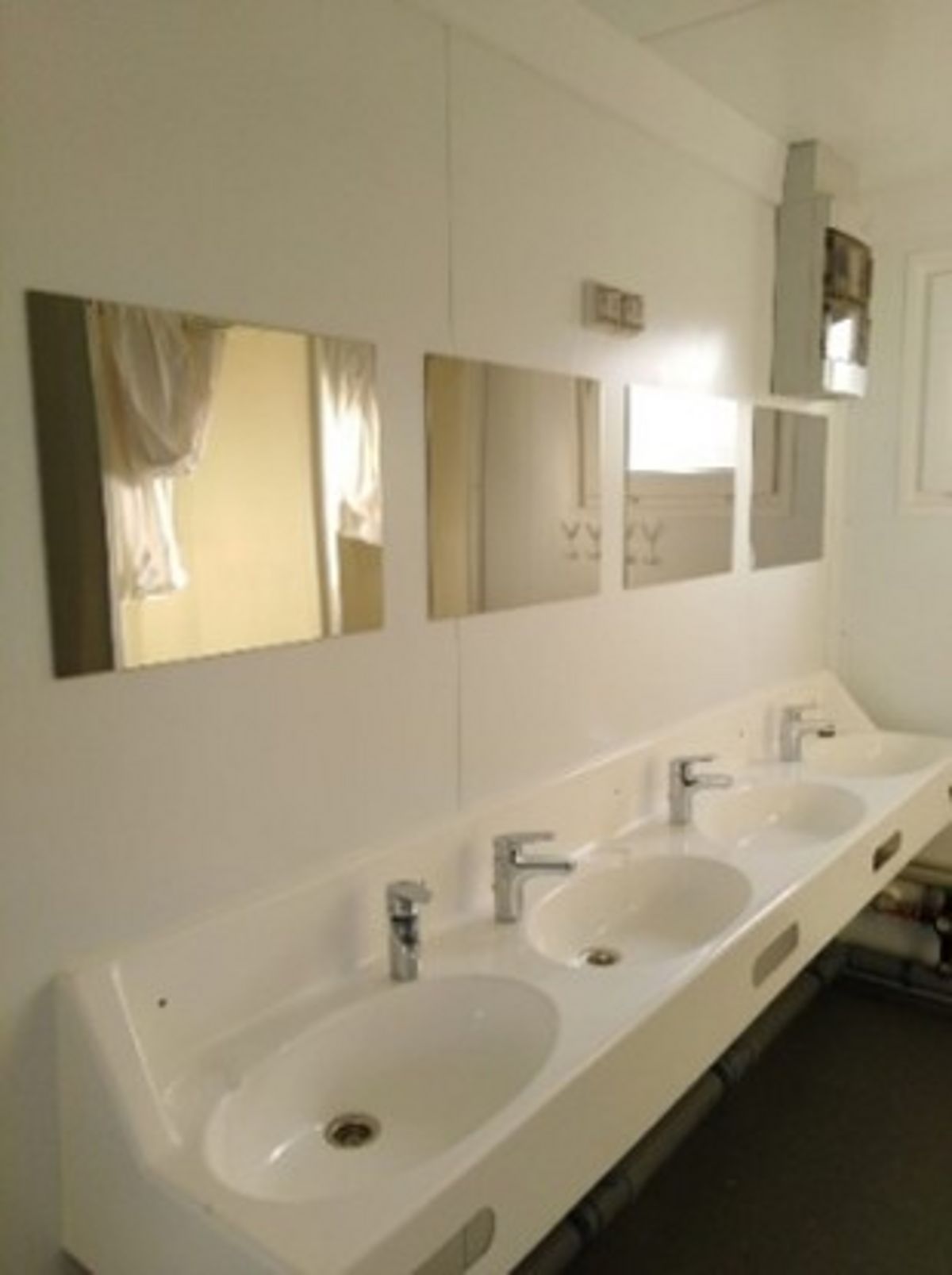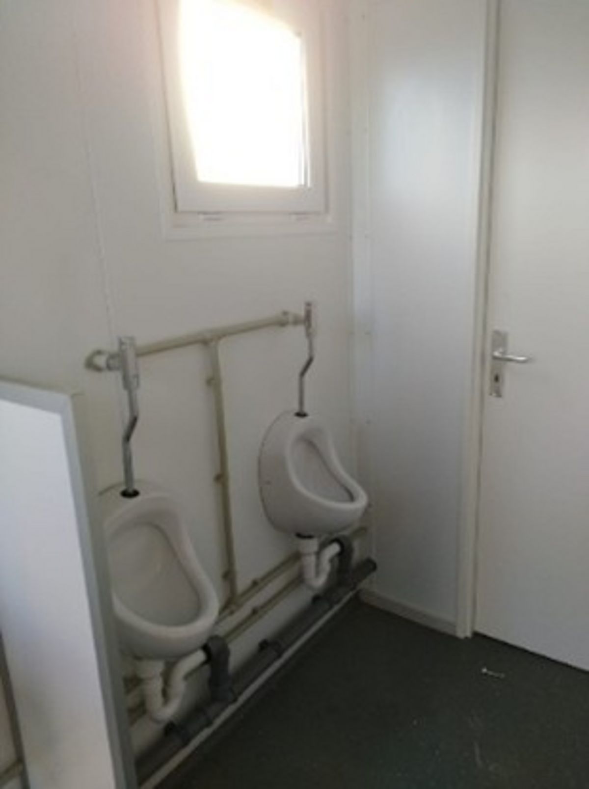 Bevat: 2 douches (inclusief douchegordijn), 2 toiletten, 2 urinoirs, 2 lavabo's